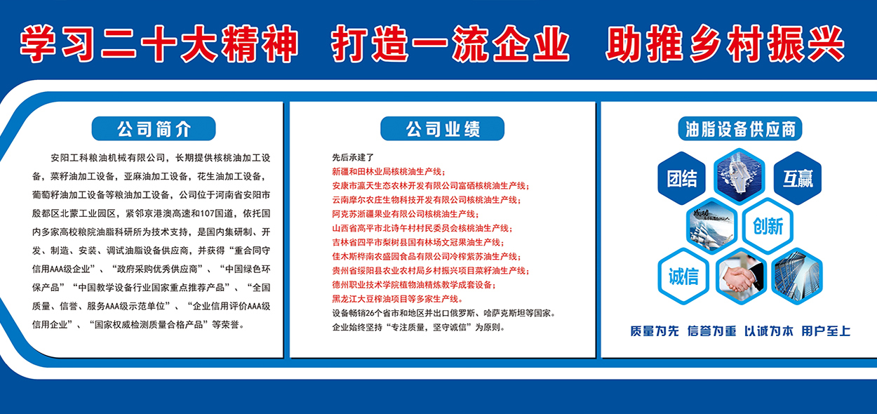 安陽工科糧油機(jī)械有限公司,長(zhǎng)期提供核桃油加工設(shè)備,茶籽油加工設(shè)備,菜籽油加工設(shè)備,亞麻油加工設(shè)備,花生油加工設(shè)備,葡萄籽油加工設(shè)備等糧油加工設(shè)備,公司位于河南省安陽市殷都區(qū)北蒙工業(yè)園區(qū),緊鄰京港澳高速和107國(guó)道,依托國(guó)內(nèi)多家高校糧院油脂科研所為技術(shù)支持,是國(guó)內(nèi)集研制、開發(fā)、制造、安裝、調(diào)試油脂設(shè)備供應(yīng)商,并獲得“重合同守信用AAA級(jí)企業(yè)”、“政府采購(gòu)優(yōu)秀供應(yīng)商”、“中國(guó)綠色環(huán)保產(chǎn)品”“中國(guó)教學(xué)設(shè)備行業(yè)國(guó)家重點(diǎn)推薦產(chǎn)品”、“全國(guó)質(zhì)量、信譽(yù)、服務(wù)AAA級(jí)示范單位”、“企業(yè)信用評(píng)價(jià)AAA級(jí)信用企業(yè)”、“國(guó)家權(quán)威檢測(cè)質(zhì)量合格產(chǎn)品”等榮譽(yù)。先后承建了新疆和田林業(yè)...